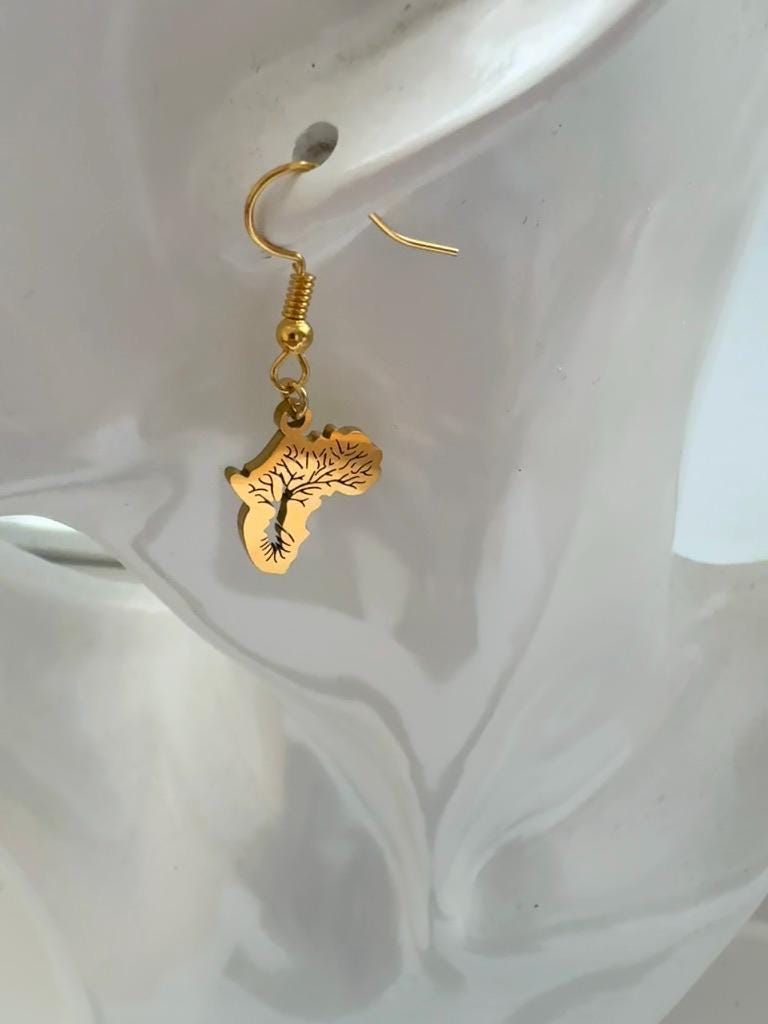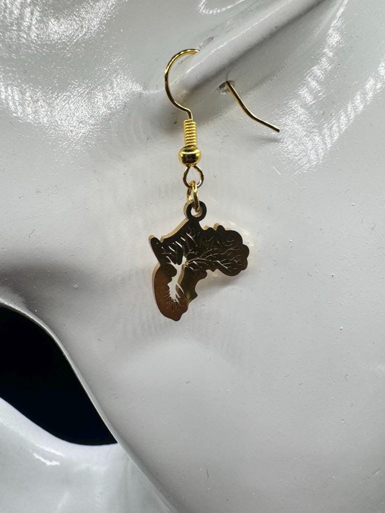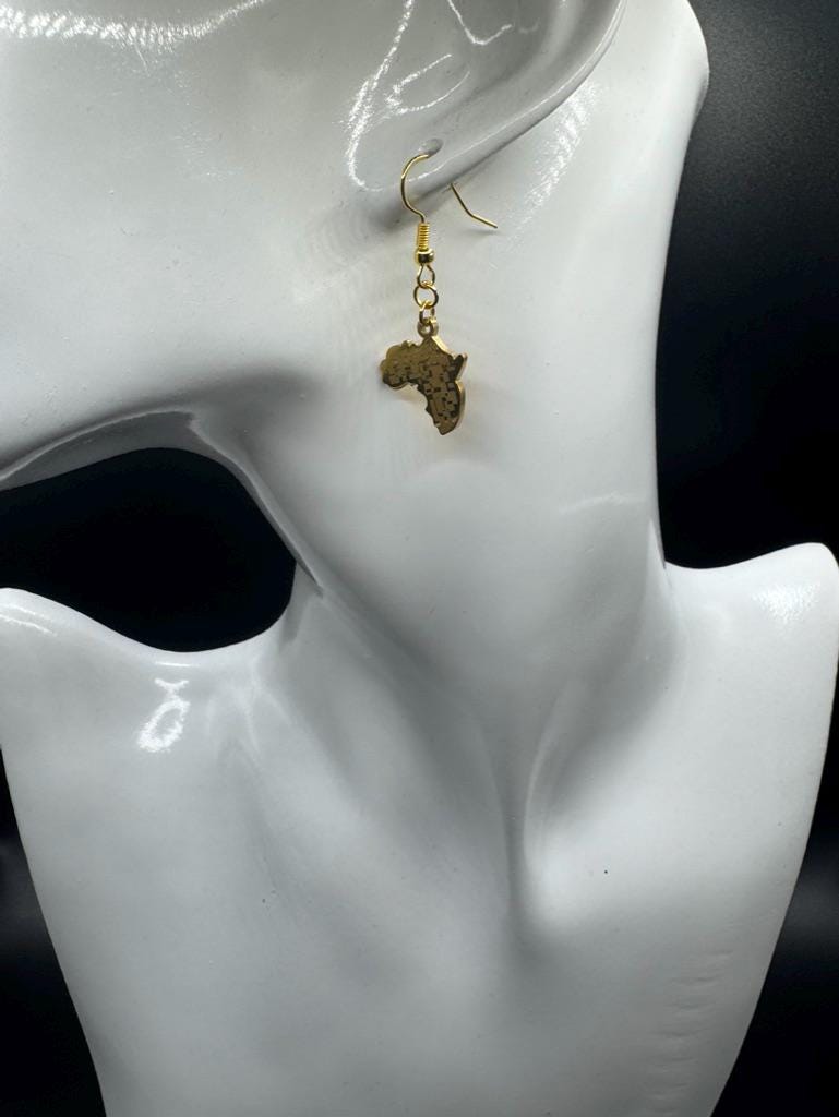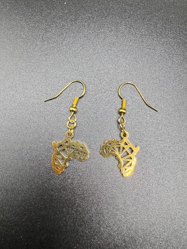 These elegant earrings are crafted with care, featuring a detailed silhouette of the African continent in gold. Lightweight and stylish, they’re perfect for everyday wear or special occasions, making a subtle yet meaningful statement about heritage, travel, and culture.