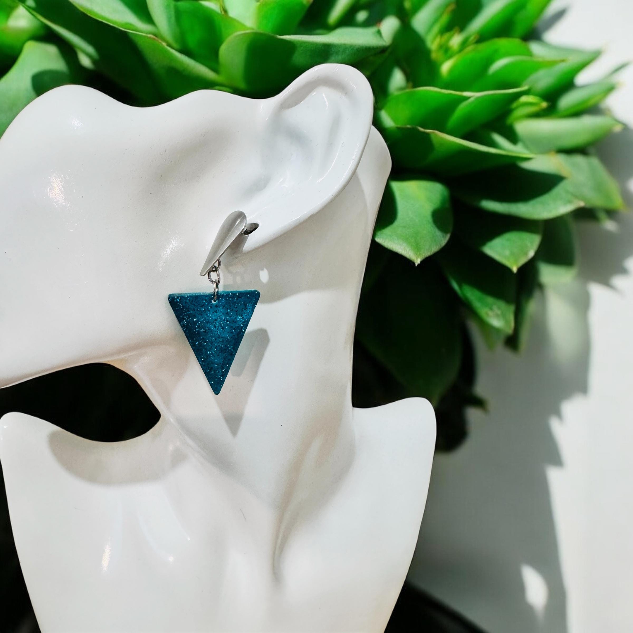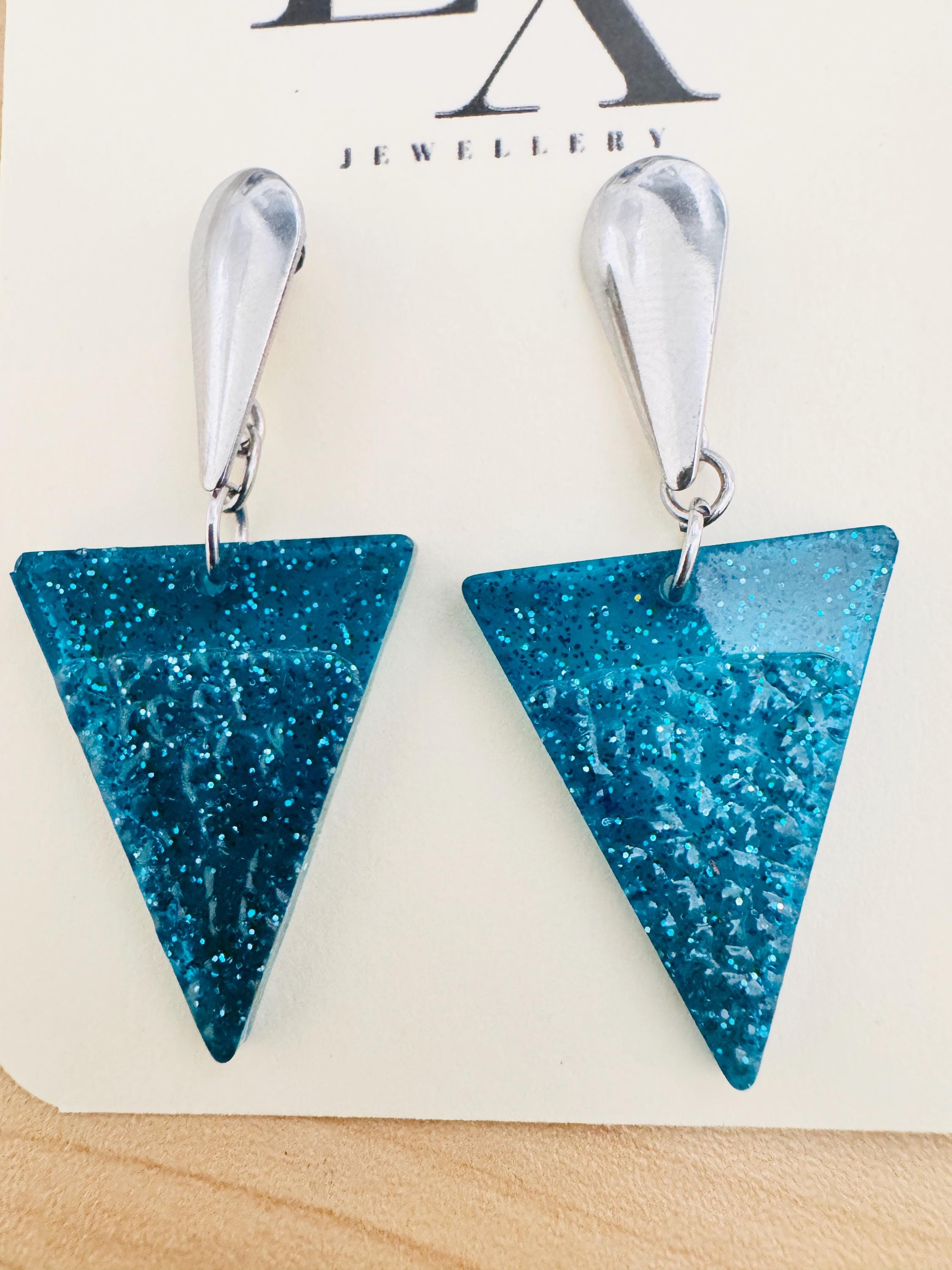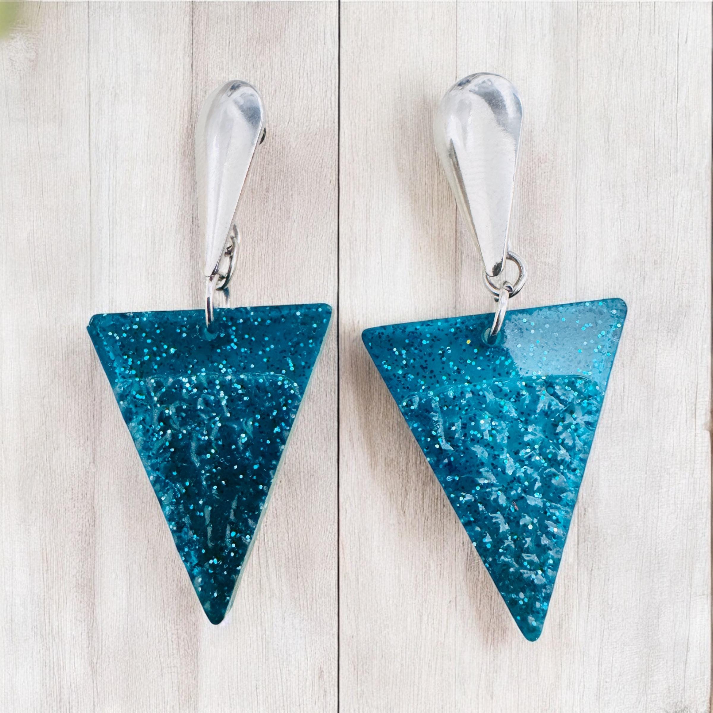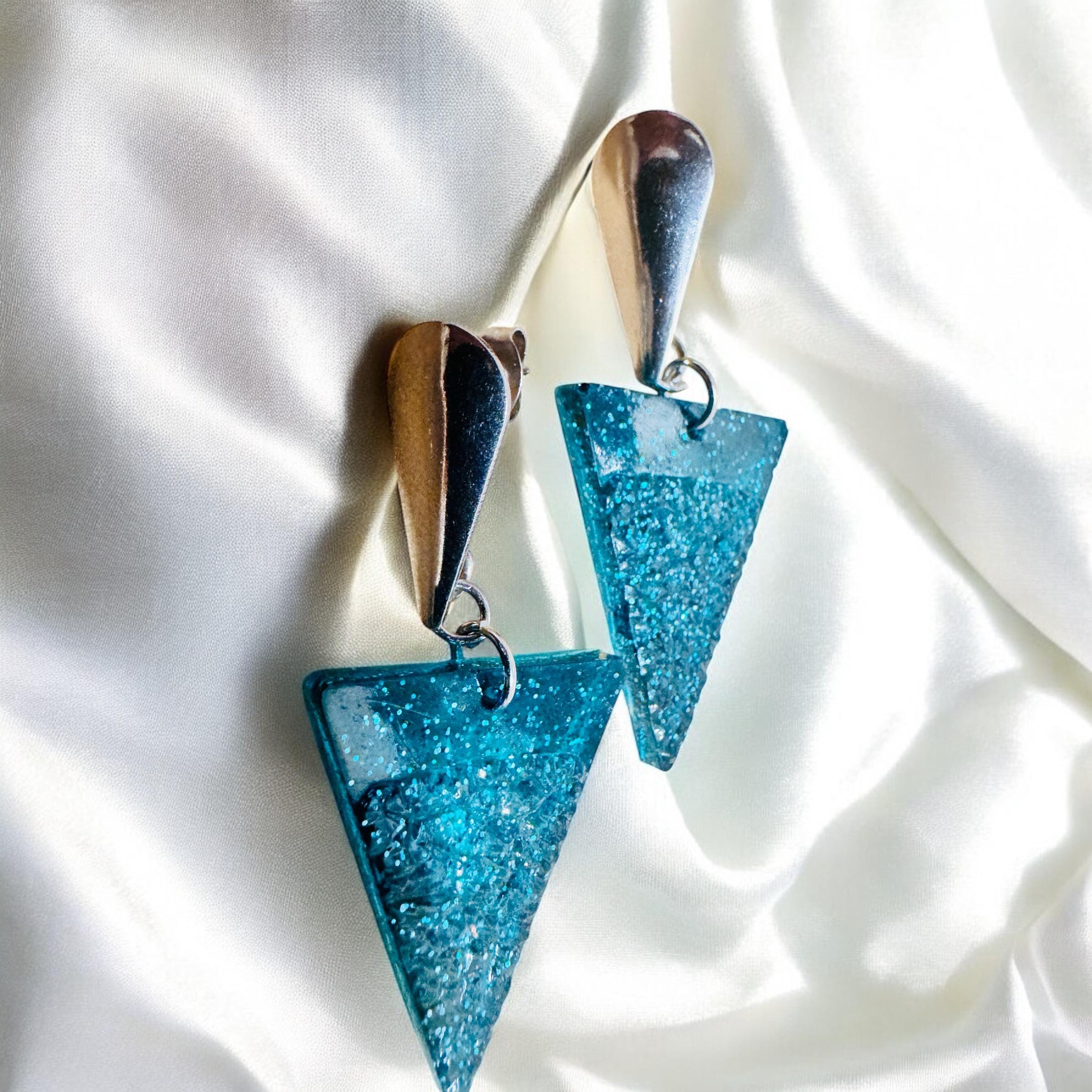These handcrafted turquoise triangle resin earrings are perfect for anyone who loves bold, geometric accessories. Lightweight and comfortable, they’re ideal for everyday wear or special occasions. The vibrant turquoise hue pairs beautifully with both casual and dressy outfits, making them a versatile addition to your jewellery collection.